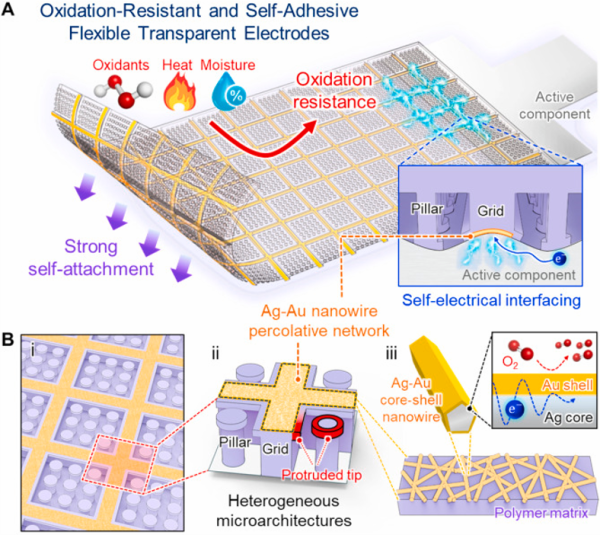 Oxidation-resistant self-adhesive flexible transparent electrodes based on Ag–Au core-shell nanowires and heterogeneous microarchitectures