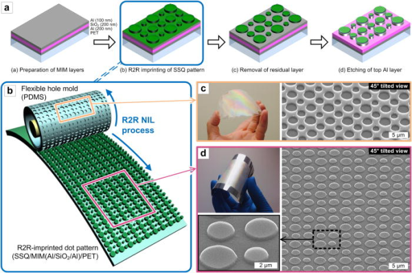 Continuous and scalable fabrication of flexible metamaterial films via roll-to-roll nanoimprint process for broadband plasmonic infrared filters