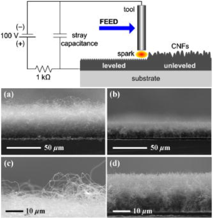 A very simple, clean, and effective method based on a reliable machining process called electrical discharge machining (EDM) was introduced in order to enhance the field emission uniformity of carbon nanofibers (CNFs). After an EDM post-treatment, the uniformity of the CNF emitters was clearly improved without contaminations, damages, or crystalline deteriorations of the CNFs. As a result, field emission uniformity was apparently enhanced at a low electric field range, promising that the method can be practical for applications requiring both large size and fine uniformity such as in a backlight unit.