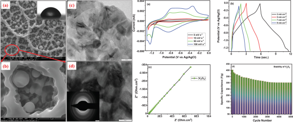 This article describes the automatic spray pyrolysis deposition (ASPD) process for the synthesis of hierarchically structured 3D nanoporous vanadium oxide (V2O5) transparent material on a fluorine-doped tin oxide (FTO) substrate. The deposition of material occurs at 673 K using an aqueous solution of NH4VO3, with a constant solution spray rate of 10 mL min−1 and airflow rate of 10 L min−1. Structural analysis confirms the pure orthorhombic structure formation of the V2O5 material, while FE-SEM images show a well-organized 3D spongy-like porous architecture. The excellent conformality of the ASPD enables the deposition of high-aspect-ratio 3D structured nanoporous V2O5 electrodes for next-generation supercapacitor applications. The hierarchical structured 3D nanoporous V2O5 electrode exhibits superior electrochemical performance in a 1M Na2SO3 electrolyte. Within the potential window 0 to -1.3 V, the electrode archives the highest specific capacitance (SC) of 453.32 F g−1 and also retains 86% of its capacitance after 5000 cycles. These properties mainly originate from the crystallinity, 3D nanoporous structure, and fast and easy ionic intercalation through the material. Furthermore, a symmetric supercapacitor device using this electrode is fabricated and which yields outstanding electrochemical performance. Overall, the results highlight the potential of 3D nanoporous V2O5 as an outstanding electrode material for next-generation supercapacitor applications.