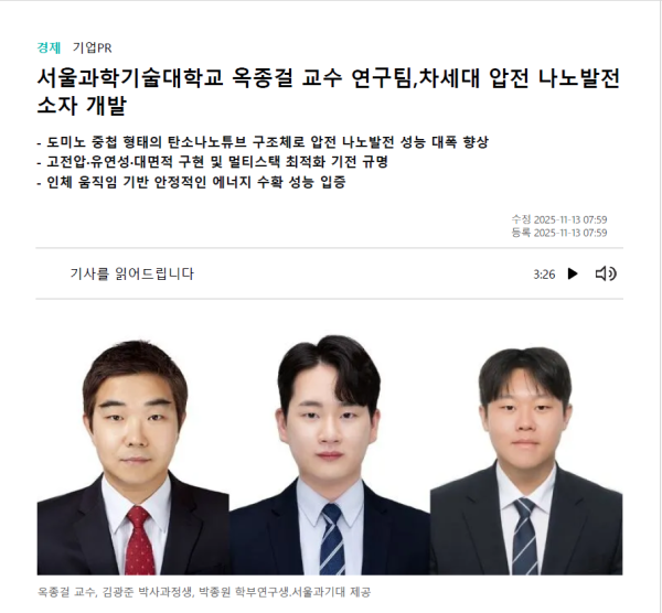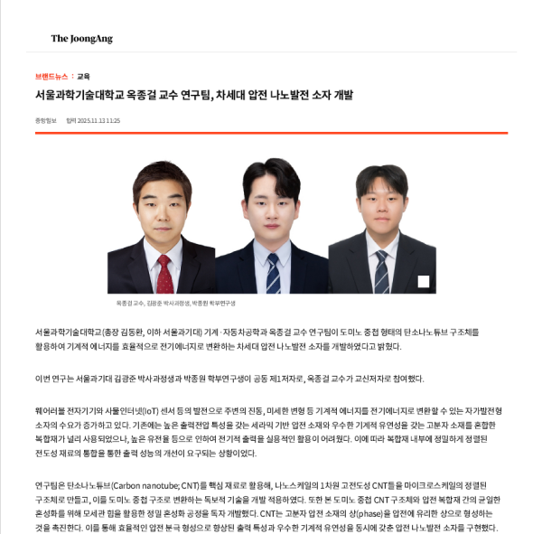 (2025/11/13한겨레)서울과학기술대학교 옥종걸 교수 연구팀, 차세대 압전 나노발전 소자 개발