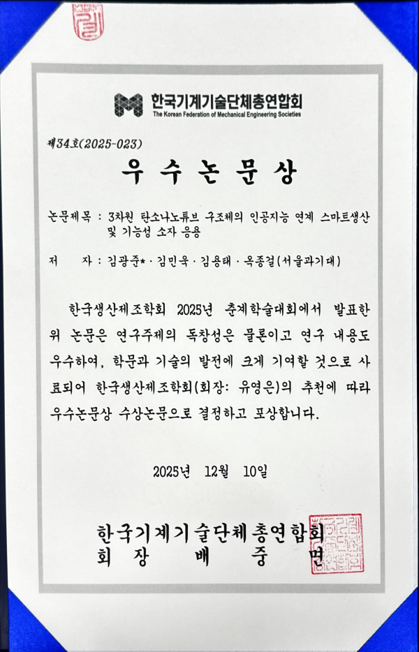 Kwangjun Kim et al. were awarded the Best Award in 2025 KMAES