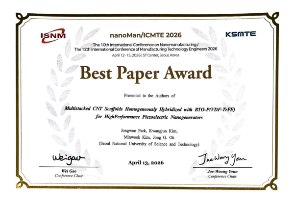 Jongwon Park et al. were awarded the Best Paper Award in 2026 ICMTE 페이지 정보 작성자 최고관리자 작성일 2026-04-17 15:21 본문 List Next Jimin Lee et al. were awarded the Best Poster Award in 2026 KMEMS 26.03.31